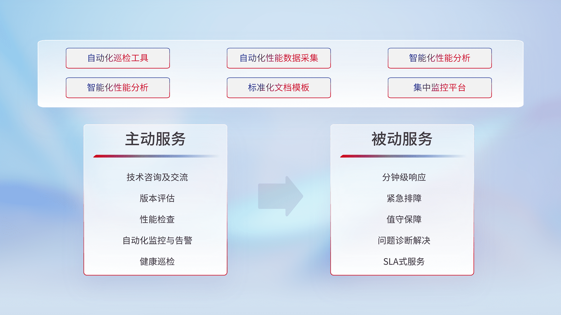 智能化工具和标准化文档,,,保障服务质量,,提供主动服务(包含技术咨询、、版本评估、、、性能检查、、、自动化监控与告警、、健康巡检)和被动服务包含(分钟级响应、、紧急排障、、、、值守保障、、、问题诊断解决、、、SLA服务)。。。