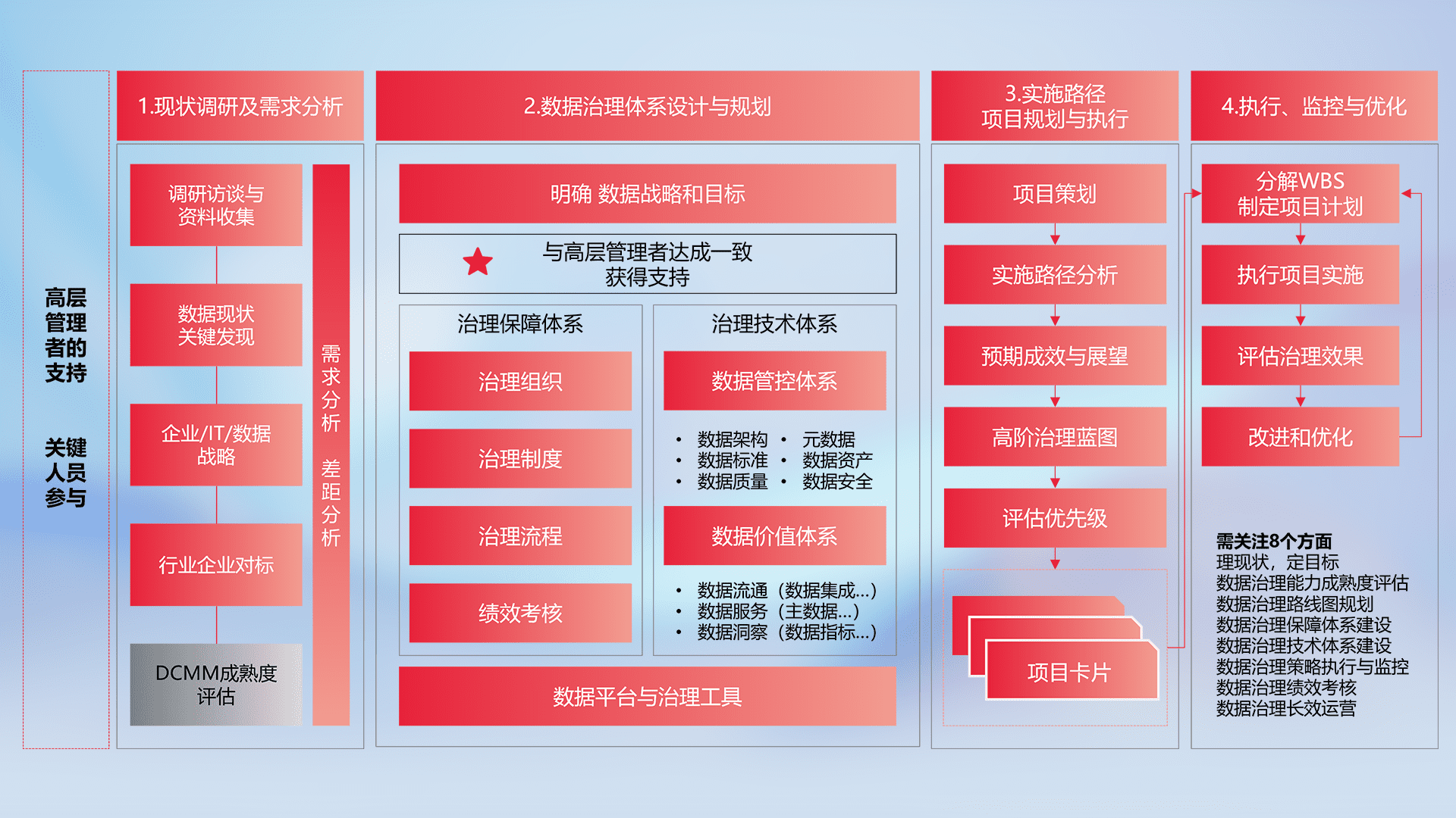 制定并执行统一的数据标准,,,规范数据定义和格式,,,,消除冗余和不一致性,,,,实现跨部门和跨系统的数据一致性,,,,为企业提供标准化的数据基础。。。